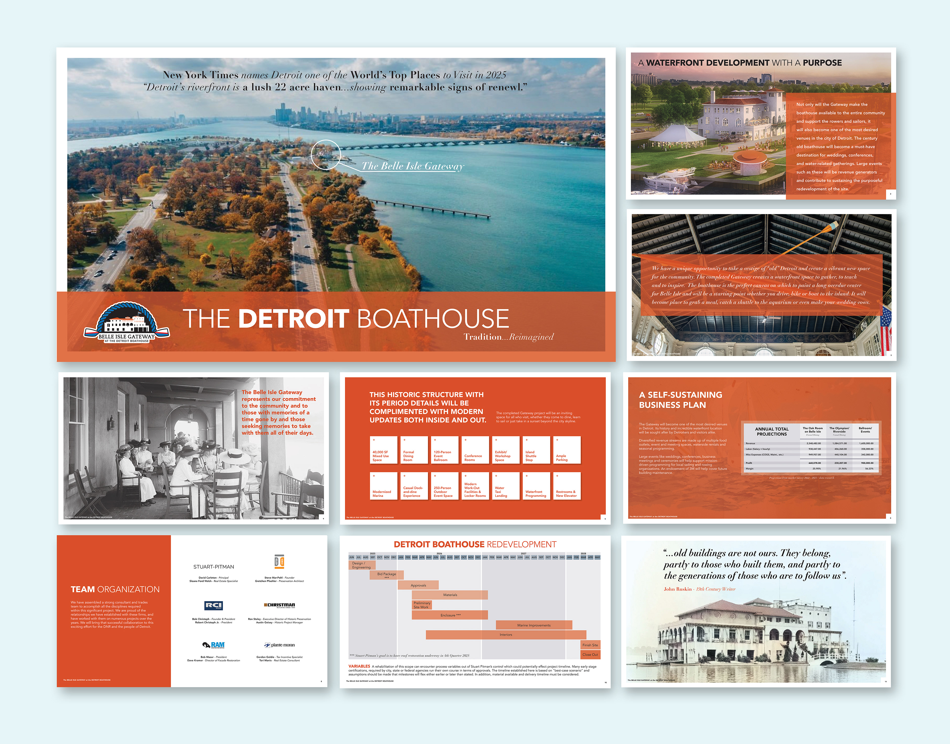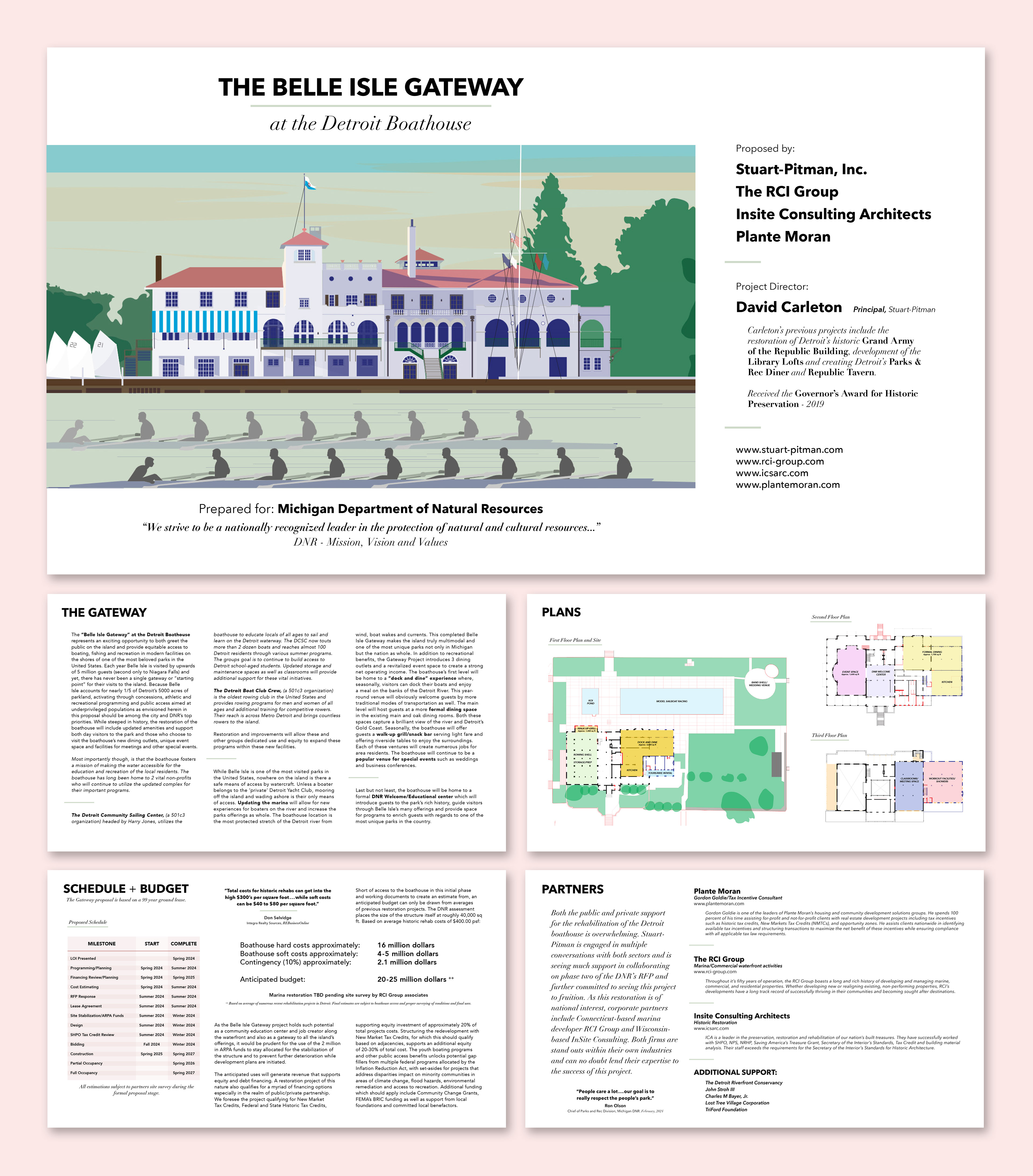In collaboration with Stuart-Pitman, a Detroit-based real estate developer, I designed their initial Letter of Intent submitted to the Michigan DNR for the rehabilitation of Detroit’s historic Boathouse on Belle Isle. I then designed and assembled a comprehensive 150+ page formal proposal, which played a key role in securing the project award. Finally, I created the pro forma and investment deck, essential tools in securing funding for this historic renovation.